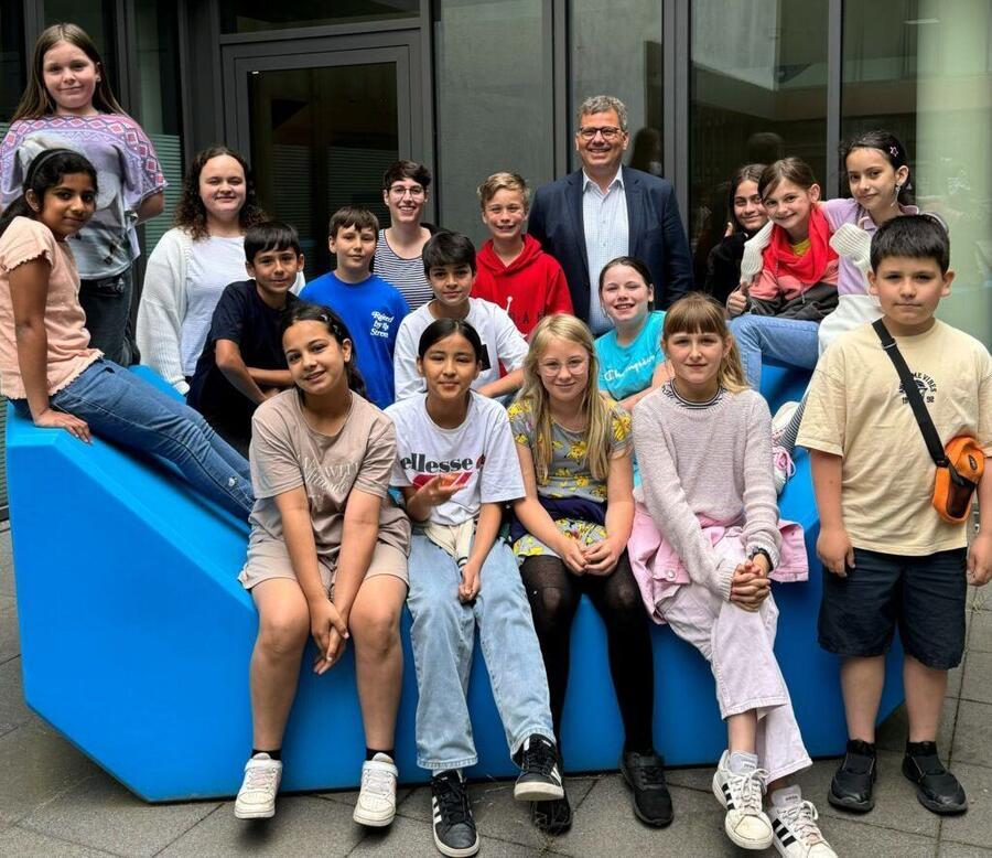 Im Zuge dessen stellten sie einen Fehler auf der Plakette der Büste von Hedwig Burgheim in der Plockstraße fest und vermissten einen Ort der Erinnerung an Fritz Pfeffer. Beides formulierten sie in einem Brief an den Oberbürgermeister, der die Anregungen der Kinder dankend aufnahm und nicht nur eine neue und fehlerfreie Plakette an der Büste, sondern auch eine Informationstafel zu Fritz Pfeffer in Aussicht stellte. Weiterhin lud er die Klasse zu sich ins Rathaus zu einem Gespräch und einer Führung ein. Dies konnte am 5. Juni 2024 umgesetzt werden. Frank-Tilo Becher nahm sich für die Schülerinnen und Schüler viel Zeit und beantwortete all ihre Fragen. Er betonte dabei auch noch einmal, wie toll er das Engagement der jungen Gießener Bürgerinnen und Bürger findet.