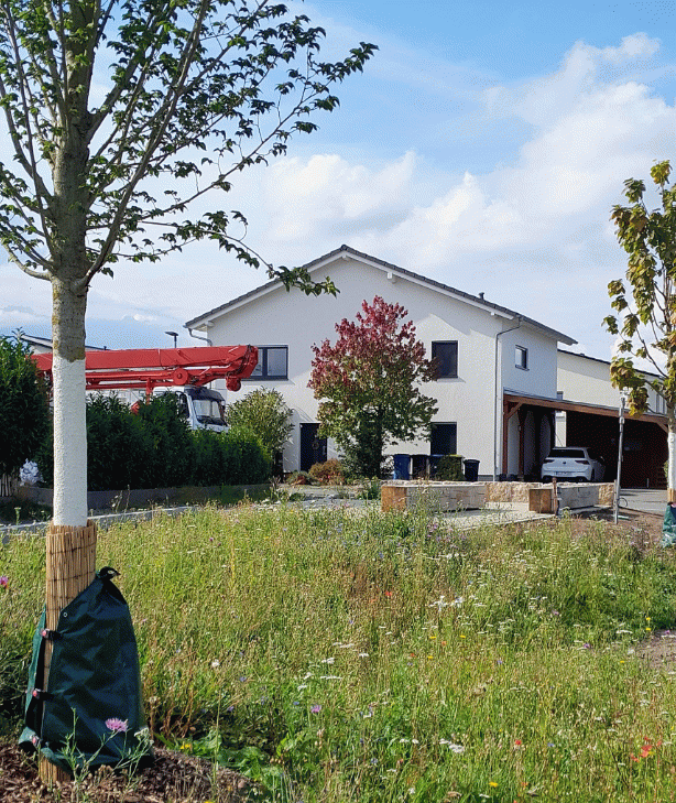 Drei Großbäume, eine großflächige Blumenwiese und eine Staudenfläche mit trockenheitsresistenten Blühpflanzen rahmen den kleinen Quartiersplatz ein.