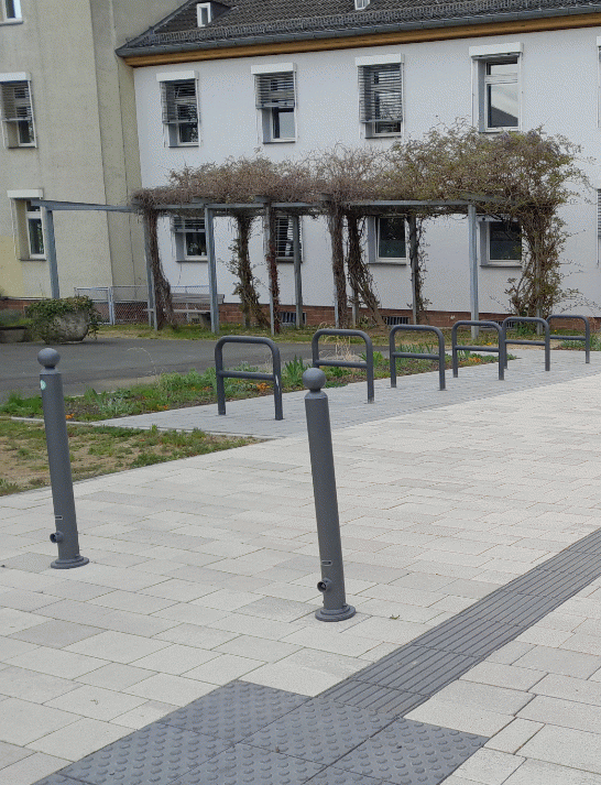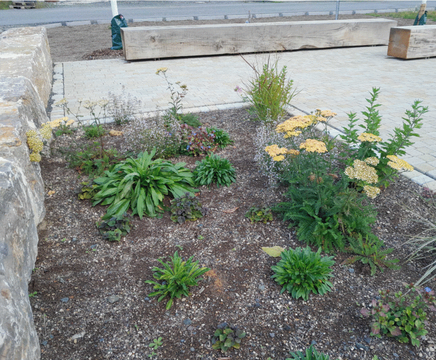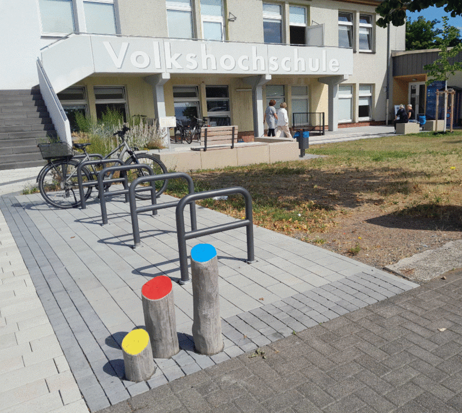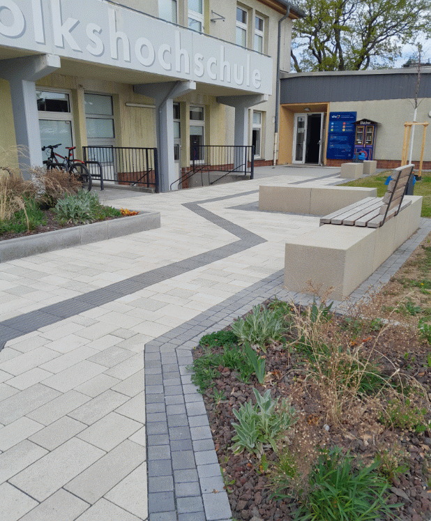 Für die neue Platzgestaltung wurden Ökopflaster, Sickerpflaster und Platten verwendet, das Regenwasser verbleibt und versickert auf den Flächen. Die versiegelten Flächen wurden von der Planerin des Gartenamtes deutlich verkleinert und zusätzliche Staudenbeete und Blumenwiese geschaffen. Ein neuer Baum wird zukünftig am Eingang zur VHS für Schatten sorgen.