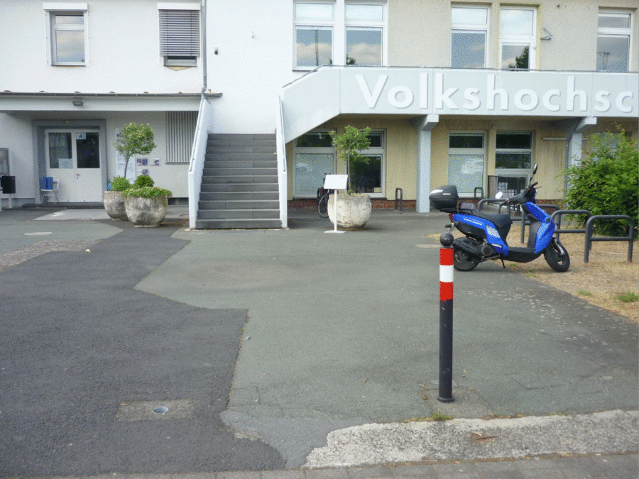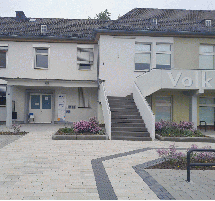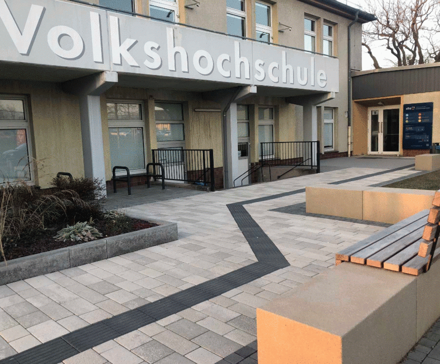 Jahrelang bestand der Vorplatz vor der Volkshochschule hauptsächlich aus einer riesigen Asphaltfläche. In mehreren Bauabschnitten wurde und wird der Asphalt ausgebaut und als Recyclingmaterial für Straßenbau zur Verfügung gestellt.