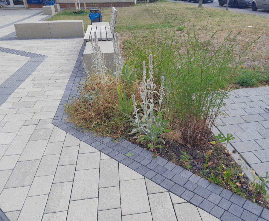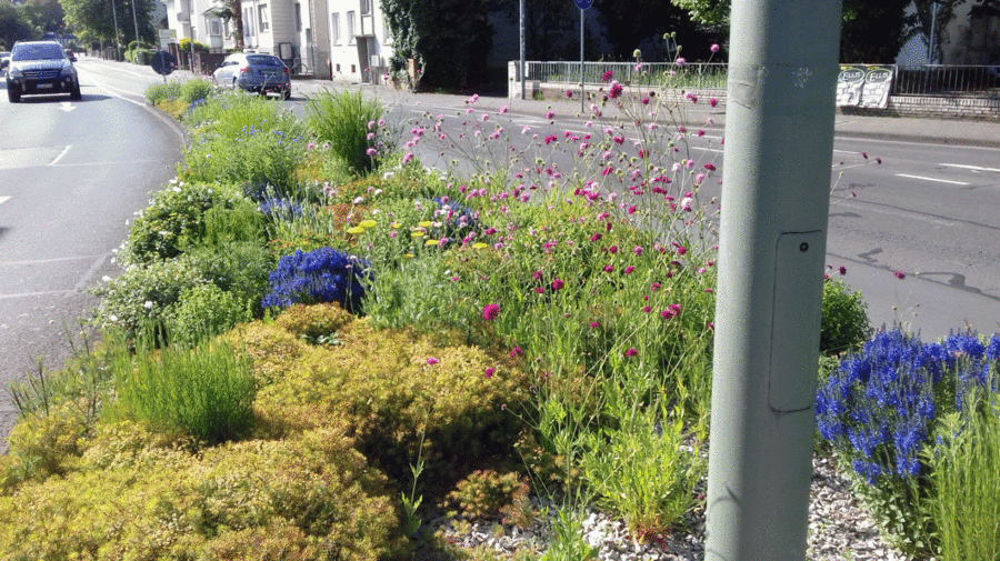 Mehrjährige Staudenbepflanzungen an Extremstandorten entlang städtischer Straßen verbessern die Bodenstruktur und sind eine wichtige Nahrungsquelle und Lebensraum für Insekten. Durch das Wurzelwerk und die Zersetzung abgestorbener Pflanzenteile wird organisches Material aufgebaut, der Boden aufgelockert und Regenwasser kann somit besser gespeichert werden.