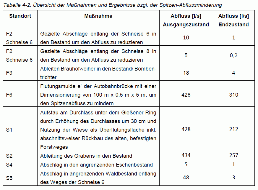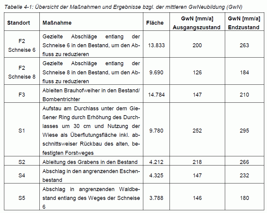 Für acht verschiedene Maßnahmen wurde die Abflussreduzierung im Starkregenfall (Tagesniederschlagssumme 91,9 mm) ermittelt, sowie die für das Überleben der Bäume in Trockenzeiten wichtige Gundwasser-Neubildung (GwN) mit dem Programm „SWAT“ - Soil and Water Assessment Tool) berechnet: