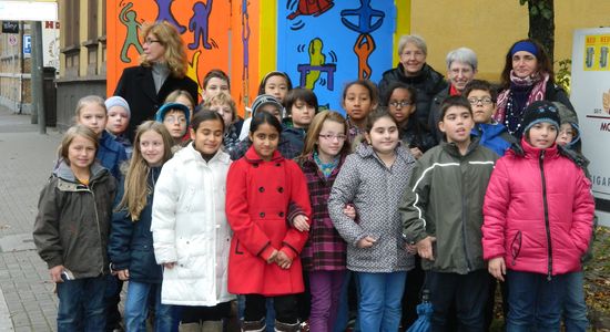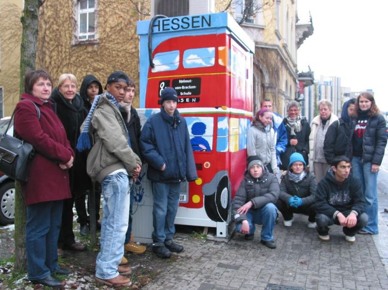 Das Bild zeigt die Künstler, die Schüler/Innen der Helmut-von-Bracken-Schule mit der Schulleiterin Sabine Wießner-Müller, Klassenlehrerin Andrea Nöllge-Haasz und Referendarin Claudia Wandelt. 2009 wurde der Messcotainer leider durch einen Auffahrunfall so beschädigt, dass er ausgetauscht werden musste.