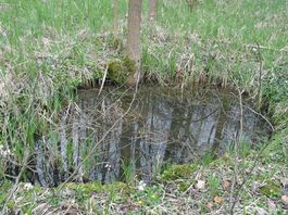 Ebenfalls sehr selten treten in Gießen Tümpelquellen oder Quelltöpfe auf. Das Wasser tritt hier meist vom Grund her in eine Bodenmulde ein. Über den Muldenrand fließt das Quellwasser dann in den sich anschließenden Quellbach. Tümpelquellen, jedoch ohne Quellbach, wurden im Schiffenberger Wald (Foto), an der Hohen Warte und in Rödgen kartiert.