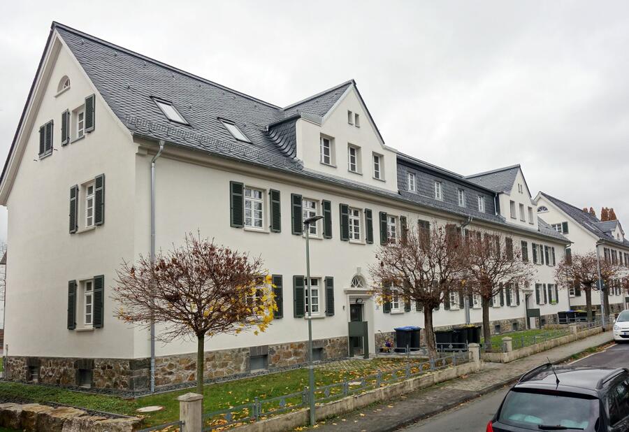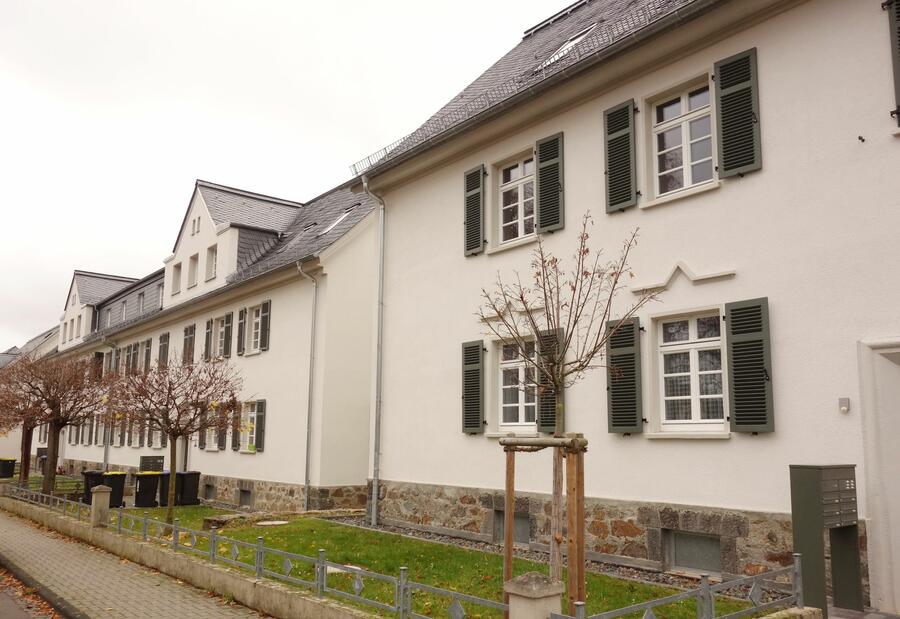 Die preiswürdige Gesamtsanierung umfasste die Fassaden, die denkmalgerechte Wärmedämmung und zugleich nachhaltige Neueindeckung der Dächer mit Schiefer, die Sanierung der Wohnungen unter Erhalt der bauzeitlichen Grundrisse und zudem zur Verbesserung der Wohnqualität den Anbau von Balkonen im Erdgeschoss nach Vorlage der Balkone im Obergeschoss. Die Jury überzeugte besonders die Fassadensanierung. Untypische, gestaltlose Kunststofffenster aus den 1970er Jahren wurden durch Holzfenster nach historischem Vorbild ersetzt und wieder Holzfensterläden montiert. Unter größtmöglicher Wahrung des historischen Erscheinungsbilds entstanden durch zusätzlichen Einbau von Dachflächenfenstern und Ergänzung von wohlproportionierten Gauben gut belichtete Wohnräume im Dachgeschoss. Zur weiteren Anpassung an moderne Lebensverhältnisse wurden aus den klein parzellierten und vernachlässigten Grünanlagen großzügige Garten- und Stellplatzanlagen im Nordwesten gestaltet, die sich gut in das Ensemble integrieren.