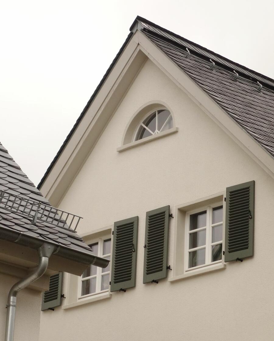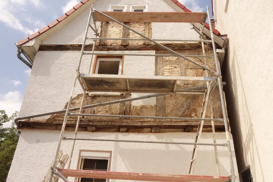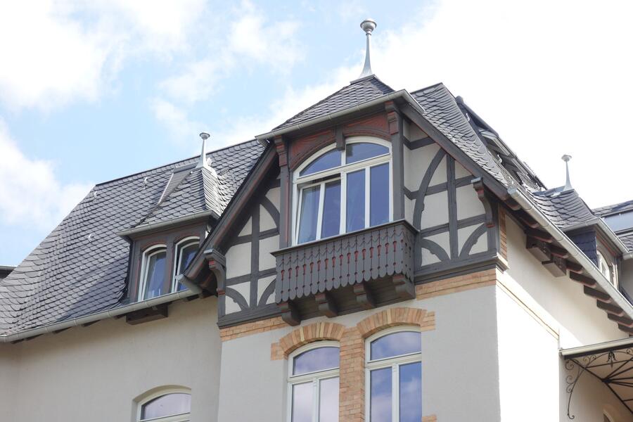 Die Holzbauteile des Dachstuhls und des Fachwerks mussten in kleinen Teilen erneuert und ergänzt werden. Des Weiteren wurden die Dachflächen mit Schiefer denkmalgerecht neu eingedeckt. Die Jury hob besonders die gelungene energetische Sanierung des Daches hervor. Dank zahlreicher zwischen Architekt und Denkmalpflege abgestimmter Dämmdetails konnte das filigrane historische Proportionsspiel der Schieferdachlandschaft trotz zusätzlicher Aufdachdämmung erhalten werden.