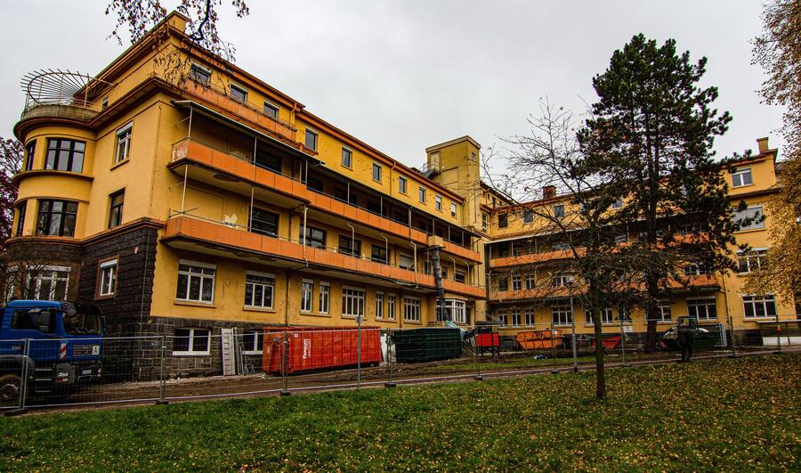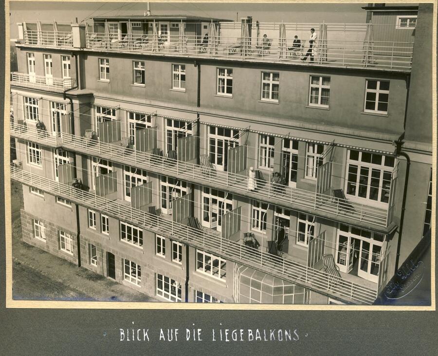 Die aufwendige Sanierung der Fassaden ist aus denkmalpflegerischer Sicht äußert gelungen, nicht zuletzt durch die weitgehende Wiederherstellung des gut dokumentierten bauzeitlichen Erscheinungsbilds. Die prägenden Fenster wurden nach historischem Vorbild detailgetreu nachgebaut und die wenigen aus der Bauzeit erhaltenen sorgfältig restauriert. Auch wenn der originale Kratzputz aufgrund eines ungeeigneten früheren Farbauftrags abgenommen und erneuert werden musste, so konnten durch restauratorische Untersuchungen die Farbgestaltung originalgetreu wiederhergestellt und das gestaltprägende Betonwerksteindekor und die architektonischen Zierelemente herausgearbeitet werden. Prägend für das Klinikgebäude sind zudem die bauzeitlichen, expressiv gestalteten Einzelbalkone auf der Nordseite, die erhalten werden konnten, sowie die filigranen Südbalkone vor den ehemaligen Krankenzimmern für die Licht-, Luft- und Sonnenbäder, denen ehemals eine wesentliche Rolle im Heilprozess zukam. Diese wurden detailgetreu nachgebaut und erhielten eine kaum wahrnehmbare Erhöhung und einen innenseitigen Überkletterschutz, um heutigen Sicherheitsansprüchen nachzukommen.