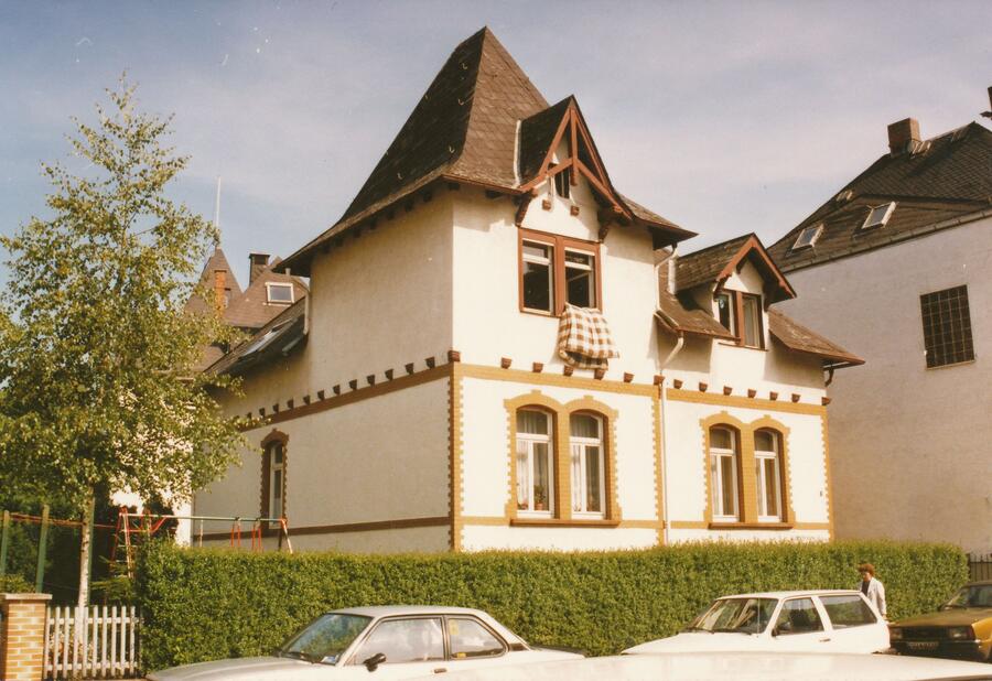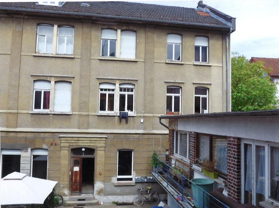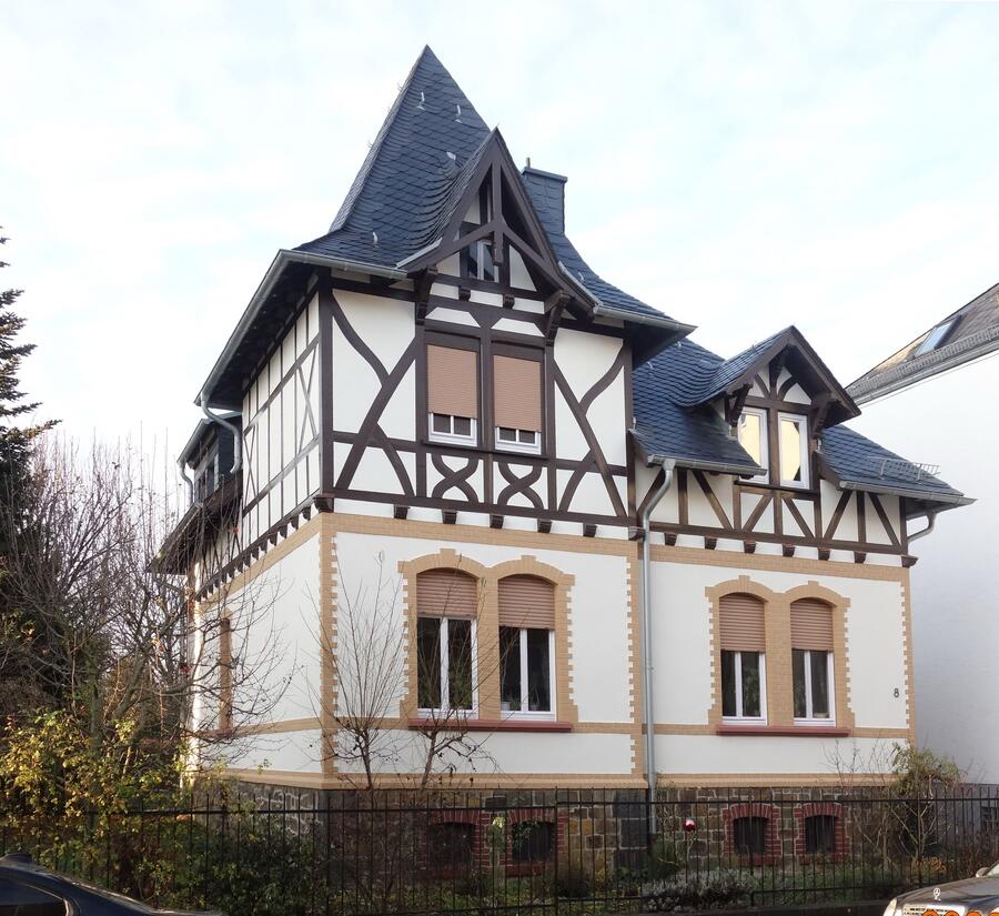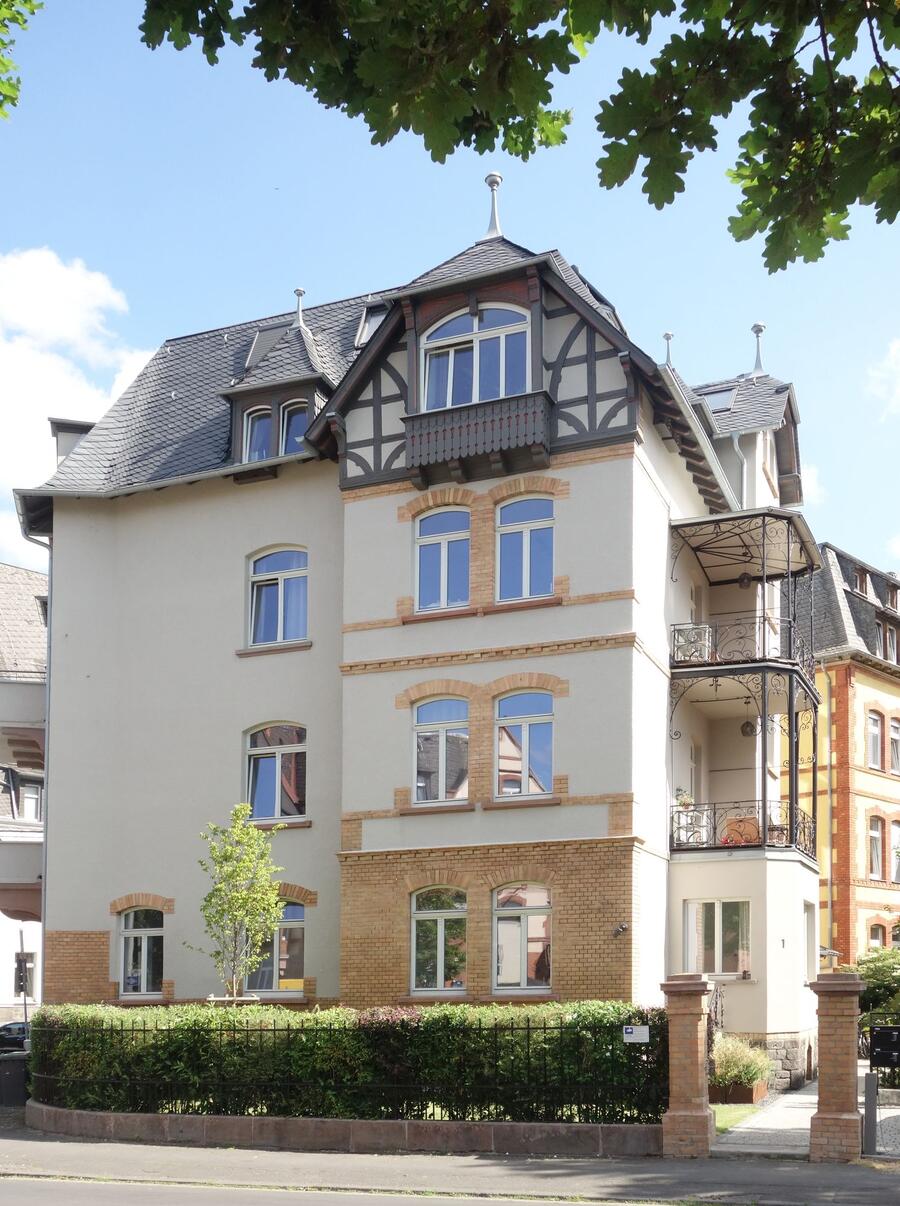 Das 1901 für einen Tabakhändler erbaute kleine Wohn- und Geschäftshaus zeichnet sich durch eine interessante verschieferte Dachlandschaft, pittoreskes Zierfachwerk im Obergeschoss und das Wechselspiel von farbigen Klinkern und Putzflächen im Erdgeschoss aus. Das Fachwerk wurde denkmalgerecht saniert und ebenso wie die Putzflächen nach historischen Farbbefunden gestaltet. Da die bei einer früheren Sanierung aufgebrachte Beschichtung der Klinker nicht ohne Substanzschäden entfernt werden konnte, wurden die vermutlich aus der Gail’schen Dampfziegelei und T(h)onwarenfabrik Wilhelm Gail stammenden Klinker im Originalton neu gefasst und durch einen farblich an den Kalkmörtel angelehnten Fugenstrich strukturiert.