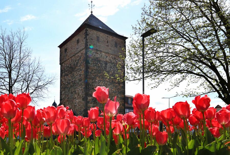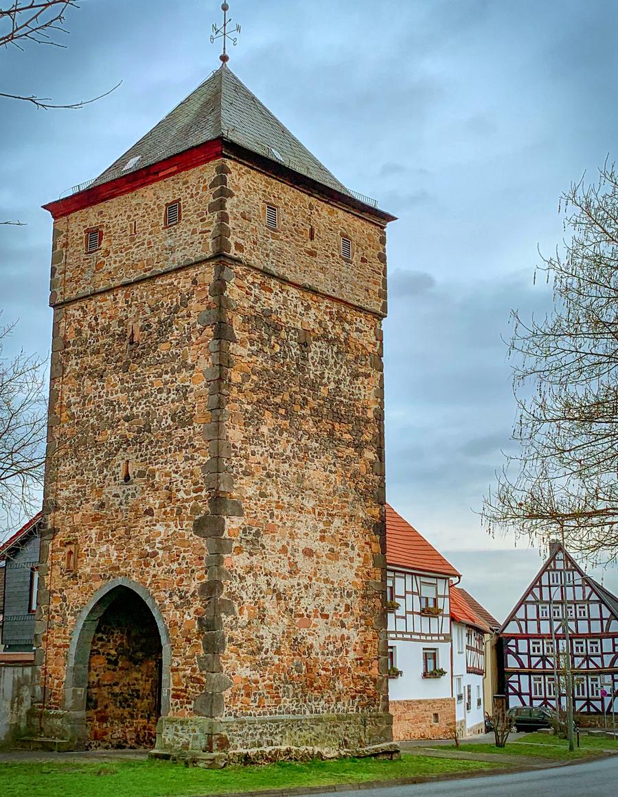 Der mächtige Wehrturm der ehemaligen Dorfbefestigung wird 1458 in seiner heutigen Form erstmals erwähnt. Deutlich ist noch eine alte Schießscharte zu sehen, mit deren Hilfe die Bauern seinerzeit plündernde Heere oder andere bewaffnete Haufen abzuwehren wussten. Allerdings darf man sich unter einer solchen Dorfbefestigung keine aufwendige Wallanlage vorstellen, wie sie Landgraf Philipp der Großmütige in Gießen errichten ließ. Vielmehr bestand die Umfestigung teilweise nur aus festen Zäunen, Hecken oder einem Graben.