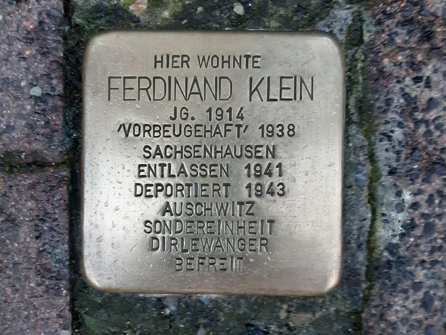 Als politischer Gefangener wurde Ferdinand Klein vom 5. bis 31. Januar 1934 im Konzentrationslager Osthofen eingesperrt. Nach seiner Entlassung kam er zurück zu seinen Eltern nach Gießen. Im Juni 1938 wurde der damals 24-Jährige in Alsfeld erneut von der Polizei festgenommen. Offenbar stand dies im Zusammenhang mit der Aktion „Arbeitsscheu Reich“, bei der in zwei Verhaftungswellen vermeintliche „Asoziale“ in Konzentrationslager „eingewiesen wurden“. Ferdinand Klein wurde nach Sachsenhausen deportiert.