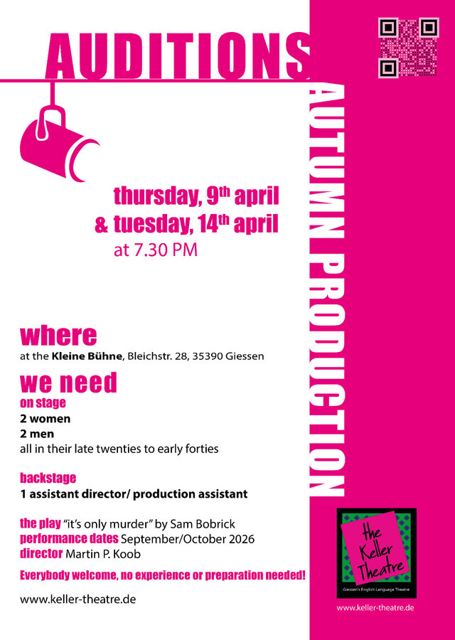 The Keller Theatre invites you to audition for its only murder, a comedic murder mystery by Sam Bobrick. When: Thursday, 9 April 2026 and Tuesday, 14 April 2026 at 7.30 pm Where: Kleine Bühne, Bleichstraße 28, 35390 Gießen We need - Actors: 2 women and 2 men, late 20s to early 40s - Production helpers: assistant director/production assistant Rehearsals will be Tuesday and Thursday evenings and some Saturday mornings. Everybody is welcome, no experience or preparation is needed. Performance dates: September/October 2026 About the play: Sam Bobricks "it's only murder" is a comedic play about Jerome Teppel, a well-off accountant who discovers his new wife, Francine, bought a gun and is having an affair with their neighbors husband. Following these discoveries, the plot descends into a chaotic mix of betrayal, humor, a prison break, and a prune danish.