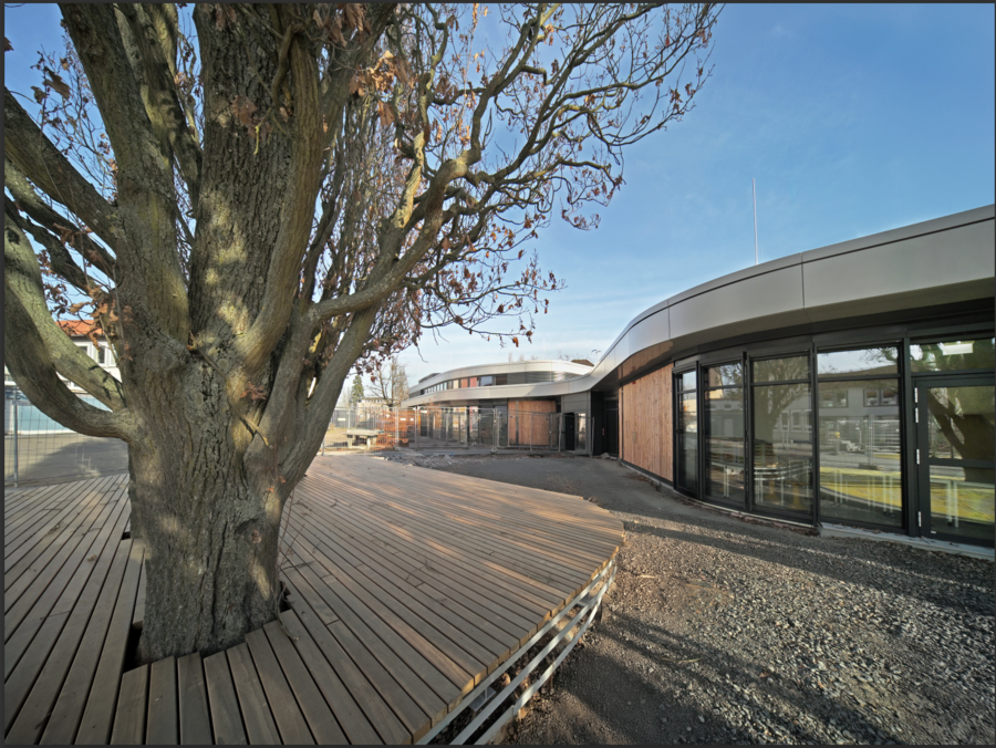 Der Neubau bietet zusätzliche Räume für den Ganztag und für pädagogische Projekte. Eine Unterrichtsküche ermöglicht Ernährungsprojekte und praktische Bildungsangebote. Ein rund 70 Quadratmeter großer Raum für kulturelle Bildung kann für Musik- und Theaterprojekte genutzt werden. Mit angrenzendem Instrumentenlager und der Möglichkeit, bei schulischen Veranstaltungen als Bühne zu dienen, erhält der Raum zugleich Aula-Charakter. Das Gebäude ist vollständig barrierefrei erschlossen, einschließlich des Zugangs zur Bühne.